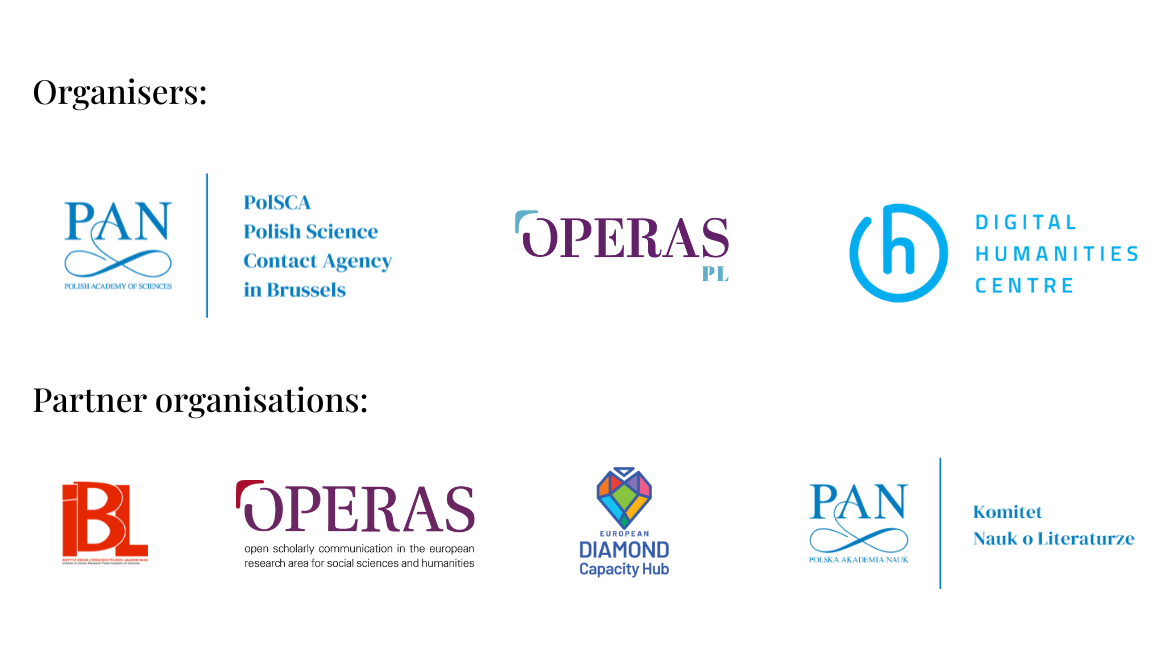 The conference is co-organised by the Digital Humanities Centre at the Institute of Literary Research of the Polish Academy of Sciences (IBL PAN, Warsaw), a leading centre for digital humanities and a key facilitator of open scholarly communication in Poland and the Polish Science Contact Agency of the Polish Academy of Science (PolSCA PAS, Brussels) with the support of OPERAS Research Infrastructure.